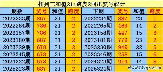 上期追忆:枚举三第2025323期奖号:687。和值21,跨度2。